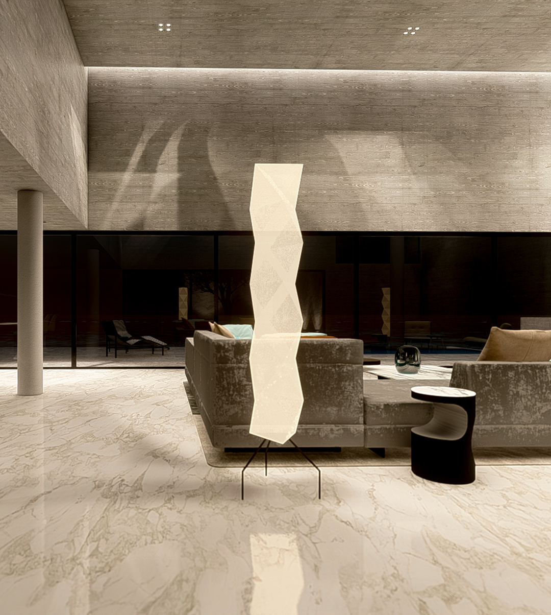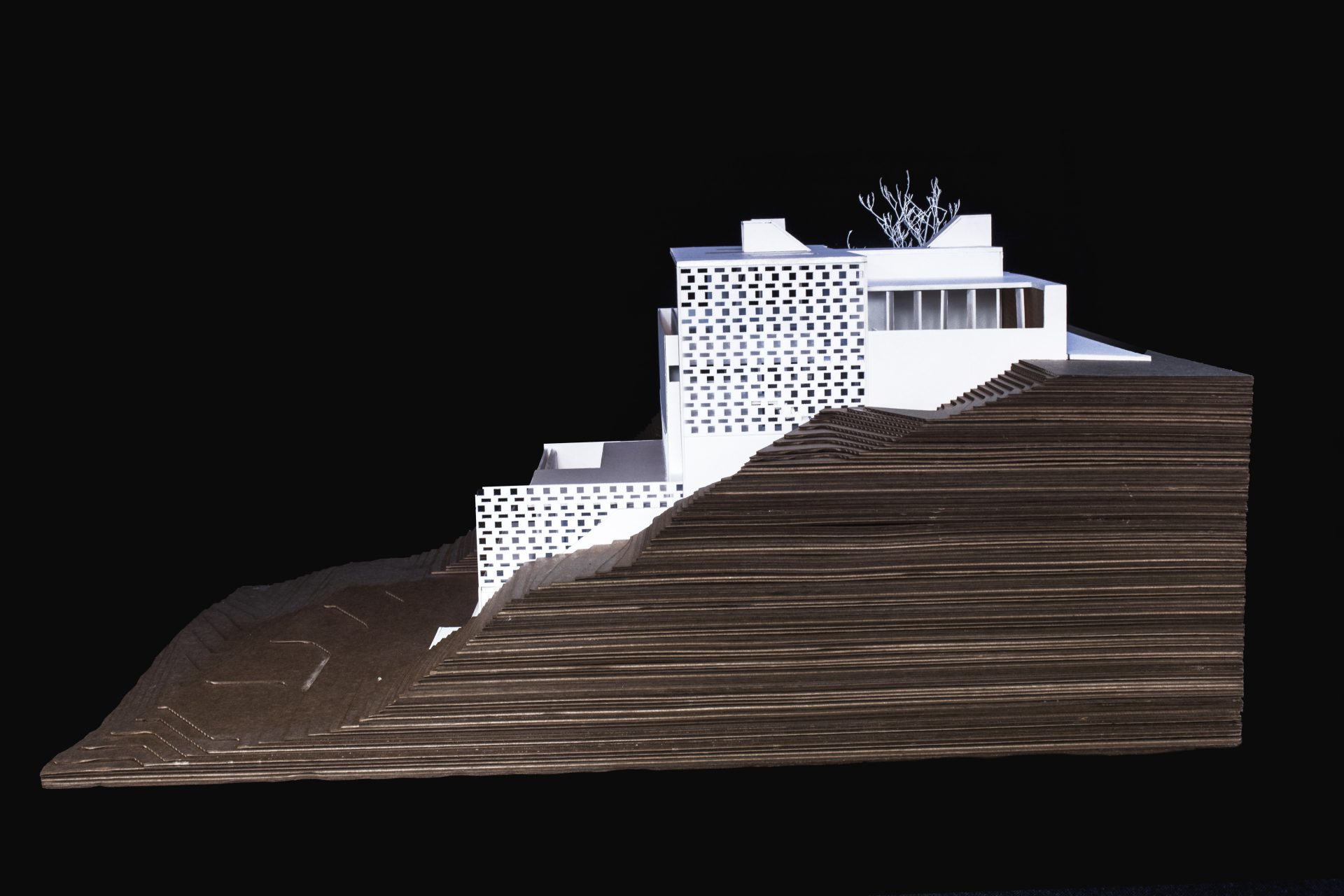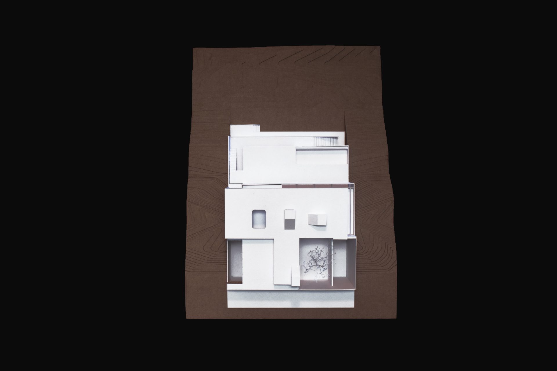 El edificio se genera a partir un patio de doble altura, que representa el espacio infinito y la forma vacía, así logra la interrelación entre el exterior e interior. El patio como arquetipo, espacio de paso y de encuentro, también es el jardín que le otorga la dimensión de casa.