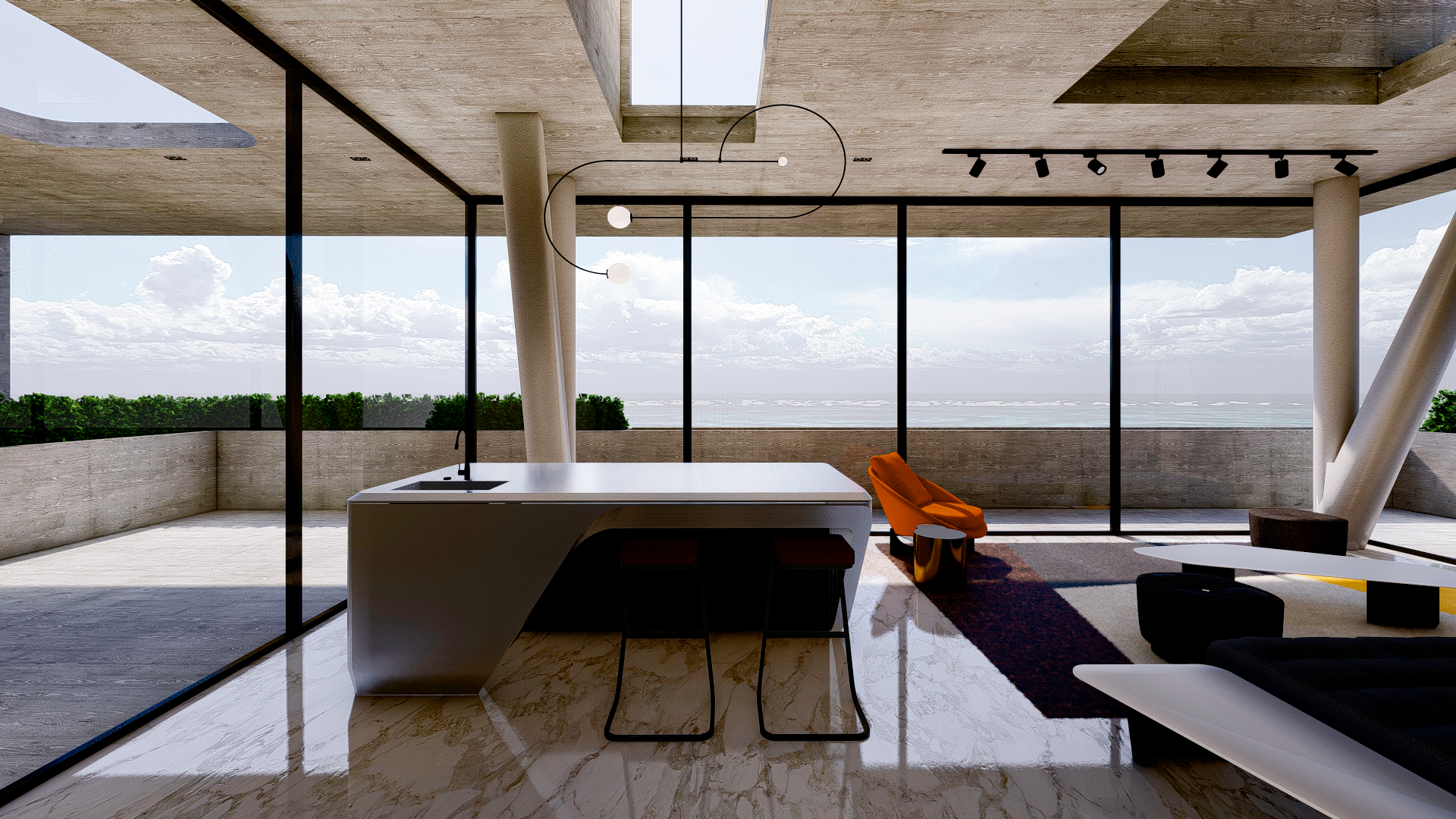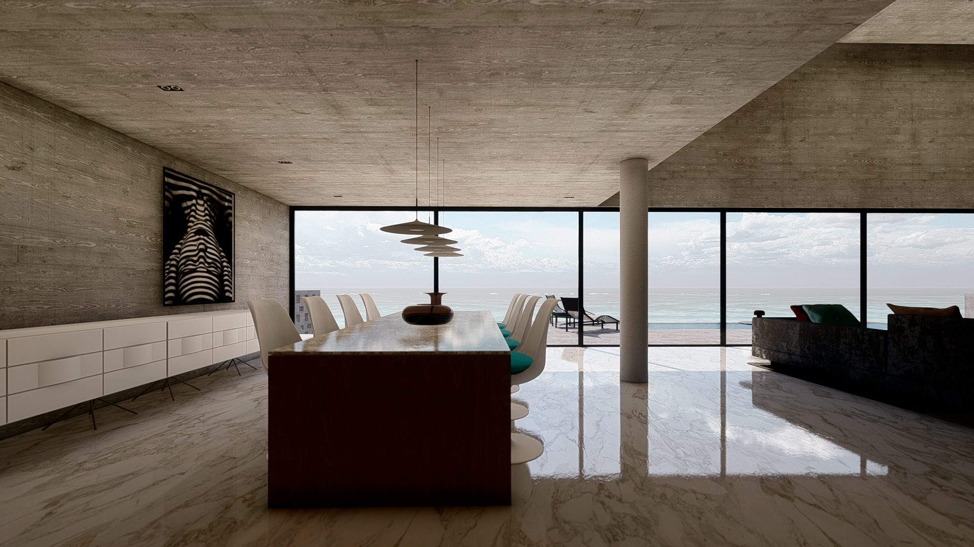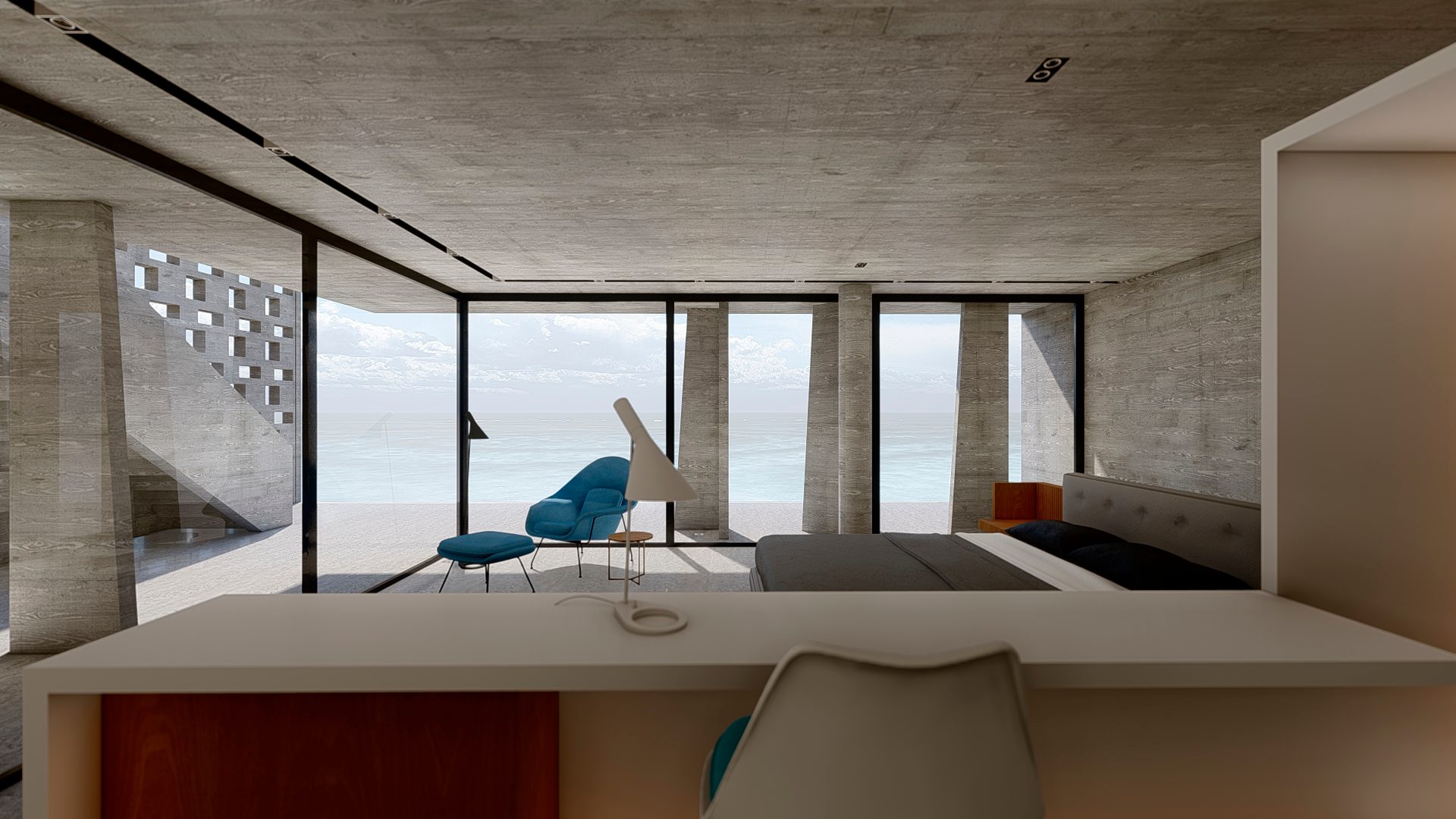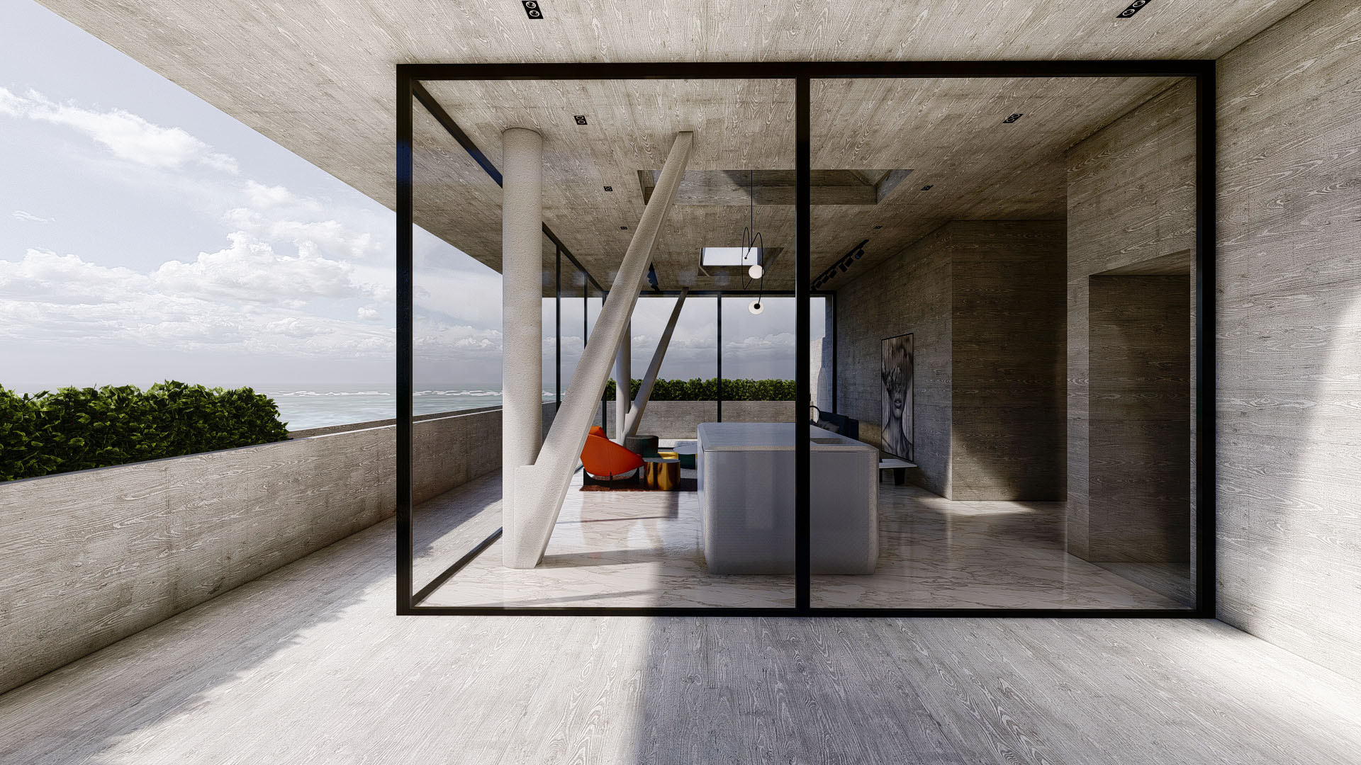 Desde el ingreso, se enmarca el paisaje que define la línea del horizonte sobre el mar, el parapeto de la terraza situado a la altura de los ojos sirve para afirmar la horizontalidad y quitarle de presencia a los elementos verticales, como las columnas, para dar la apariencia, que el techo no tiene soporte, sensación que se acentúa por los volados y las teatinas con la entrada de luz de forma homogénea.