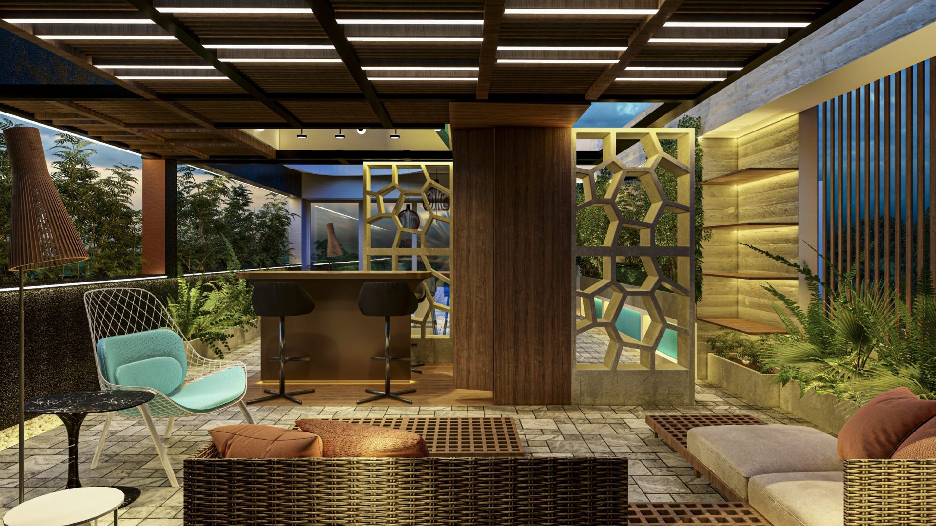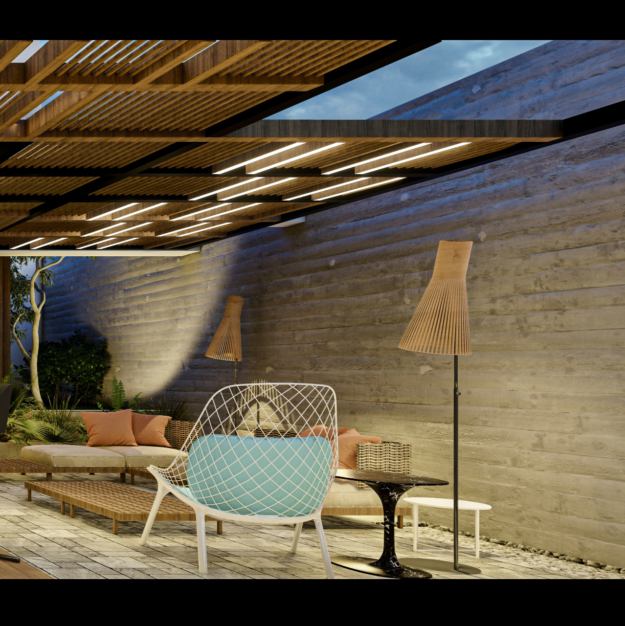 No es necesario cubrir toda la terraza con techo, se busca que el cielo se abra en todas las direcciones, para generar claros y oscuros, pero si es necesario que todas las áreas queden provistas de luz. Se apertura a un lado en toda su longitud, para hacer parecer que el horizonte está más cerca y pertenece al espacio interior.